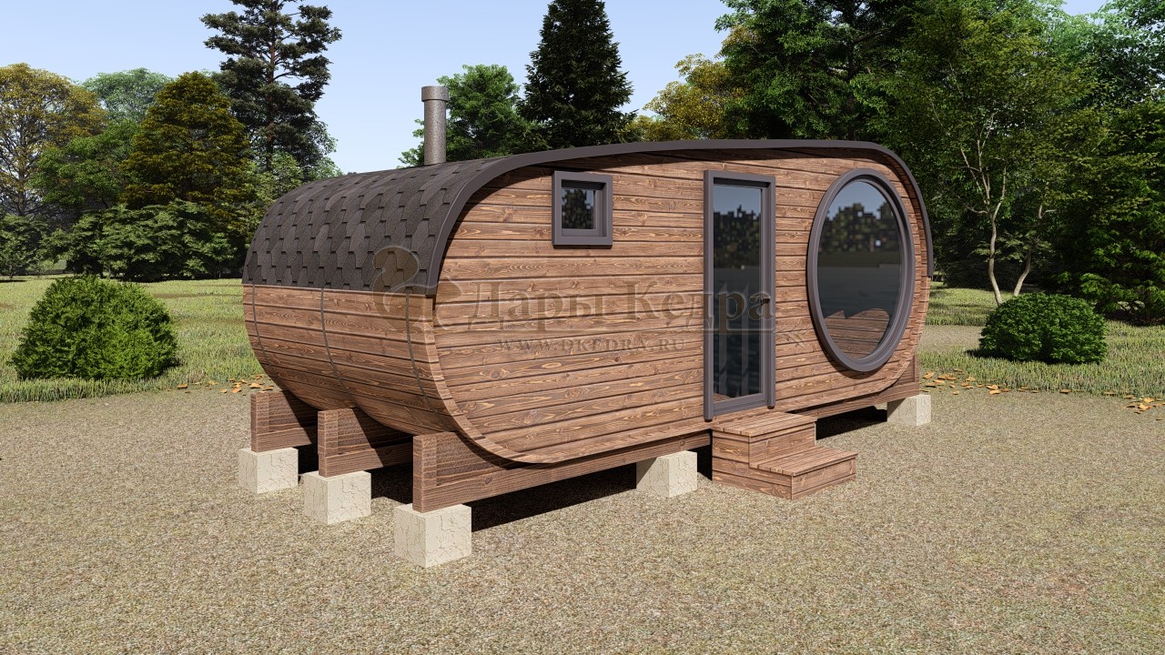 Баня-бочка круглая из кедра с козырьком (все размеры) Это изделие круглой вытянутой формы. Козырек не только украшает баню, но и защищает оставленную обувь от дождя. Лавочки из кедра находятся по всей длине бани-бочки с обеих сторон. Печь расположена в парилке около дальней стены. Время растопки такой печи не превышает 30 минут. В зависимости от выбранного размера круглая баня-бочка с козырьком имеет следующую комплектацию: Круглая баня-бочка 2,5 метра - парилка; Круглая баня-бочка 3,5 и 4,5 метра - раздевалка, парилка; Круглая баня-бочка 5,5 метров - раздевалка, парилка, моечная. По вашему желанию ее можно укомплектовать печью с внешней загрузкой, благодаря которой весь мусор вовремя топки остается на улице. Круглая баня-бочка не требует полноценный фундамент, поэтому при необходимости ее можно перенести в другое место. Обращаем Ваше внимание, что в стандартную комплектацию бани входят лавки в парной с обеих сторон. Дополнительно можно заказать полок открытого или закрытого типа! Кедр обладает ароматическими свойствами. Он не деформируется и влагоустойчив, при правильном уходе за деревом на нем не развиваются грибки и плесень.
