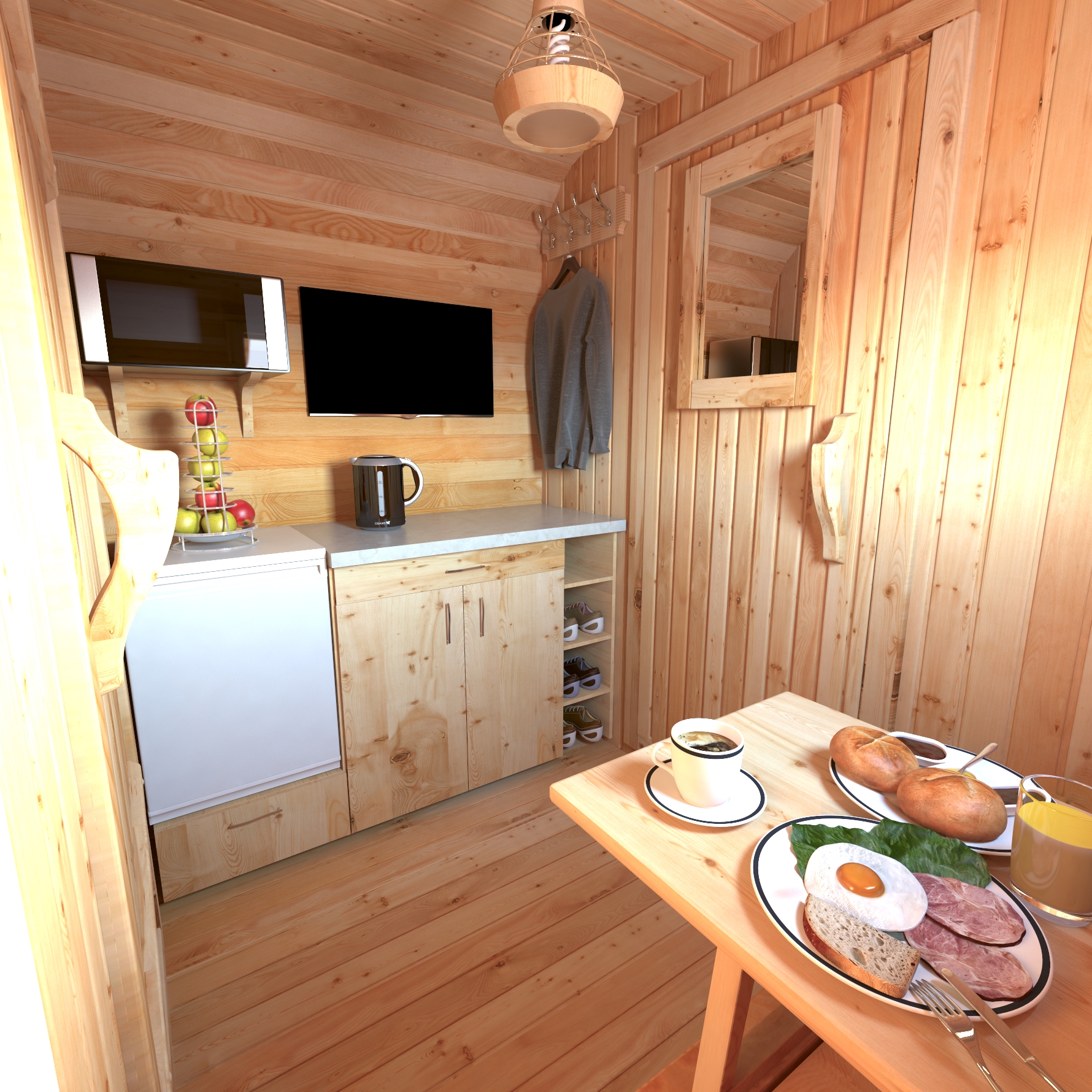 Это более просторная модель за счет увеличенной высоты потолков и ровного пола. В такой модели раздевалка совмещена с моечной. Тут установлен душевой поддон, вешалка, полочка и лавочка из кедра. В парильном отделении по обе стороны расположены двухуровневые открытые полки, печь находится между ними у дальней стены. Время растопки такой бани не превышает 30 минут. По вашему желанию баню-бочку можно укомплектовать козырьком, верандой и печью с внешней загрузкой, благодаря которой весь мусор во время топки остается на улице. Баня-бочка буханка не требует полноценный фундамент, поэтому при необходимости ее можно перенести в другое место.
