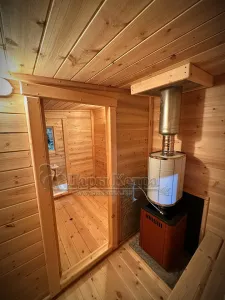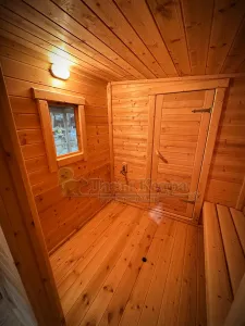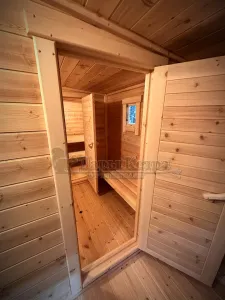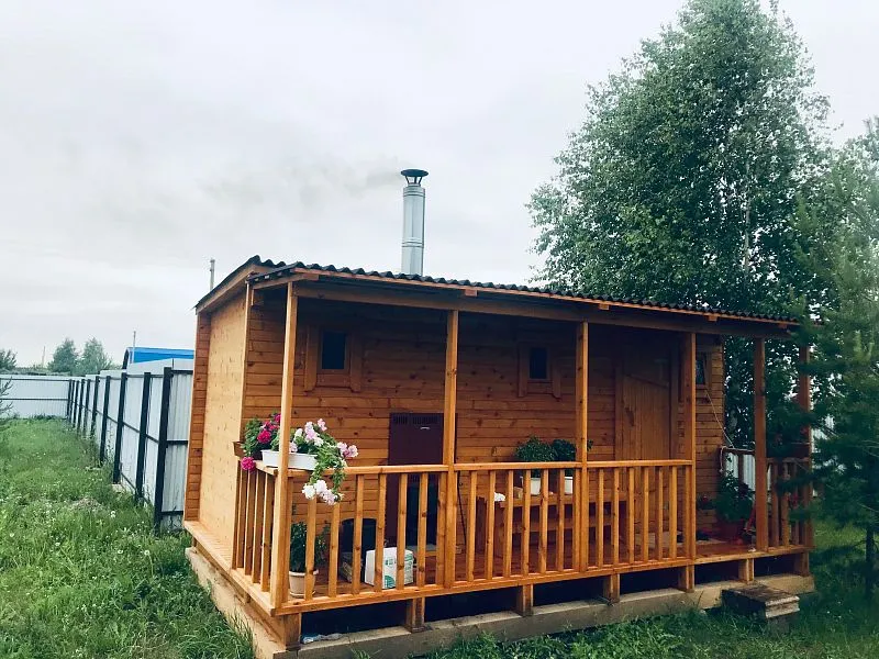 Это классическая прямоугольная модель бани с тремя отделениями: предбанником, моечной и парилкой. Для удобства пользования предбанник оснащен лавочкой и вешалкой. В моечной находится лавка и полочка из кедра. Парилка оборудована двухуровневым открытым полком и печью. Время растопки такой бани не превышает 30 минут. На просторной веранде можно оставить вещи или отдохнуть после парения. Каркасно-щитовую баню можно заказать как в готовом, так и в разборном варианте. В разборной модели готовые щиты из кедра быстро собираются в полноценное строение, что также позволяет исключить лишний строительный мусор. Такая баня не требует полноценный фундамент, поэтому при необходимости ее можно перенести в другое место.
