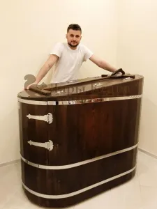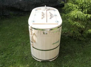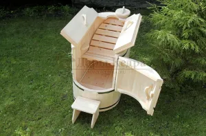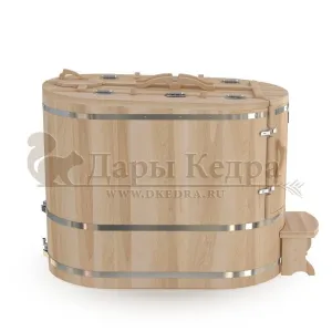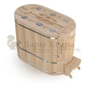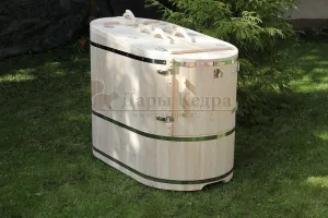 Кедровая фитобочка полулежачая - это мини парная, которую можно использовать не только в спа-салонах, но и дома. Модель этой бочки наиболее комфортна, так как позволяет принимать процедуры полулежа. Толщина стенок составляет 25 мм. Фитобочка оборудована откидными створками, дверцей и отверстием для головы. Во время парения человек находится внутри кедровой бочки, а голова снаружи. Благодаря этому исключается возможность перегрева. Подлокотники, подспинник из кедра и внутренние ручки делают эксплуатацию фитобочки более удобной.