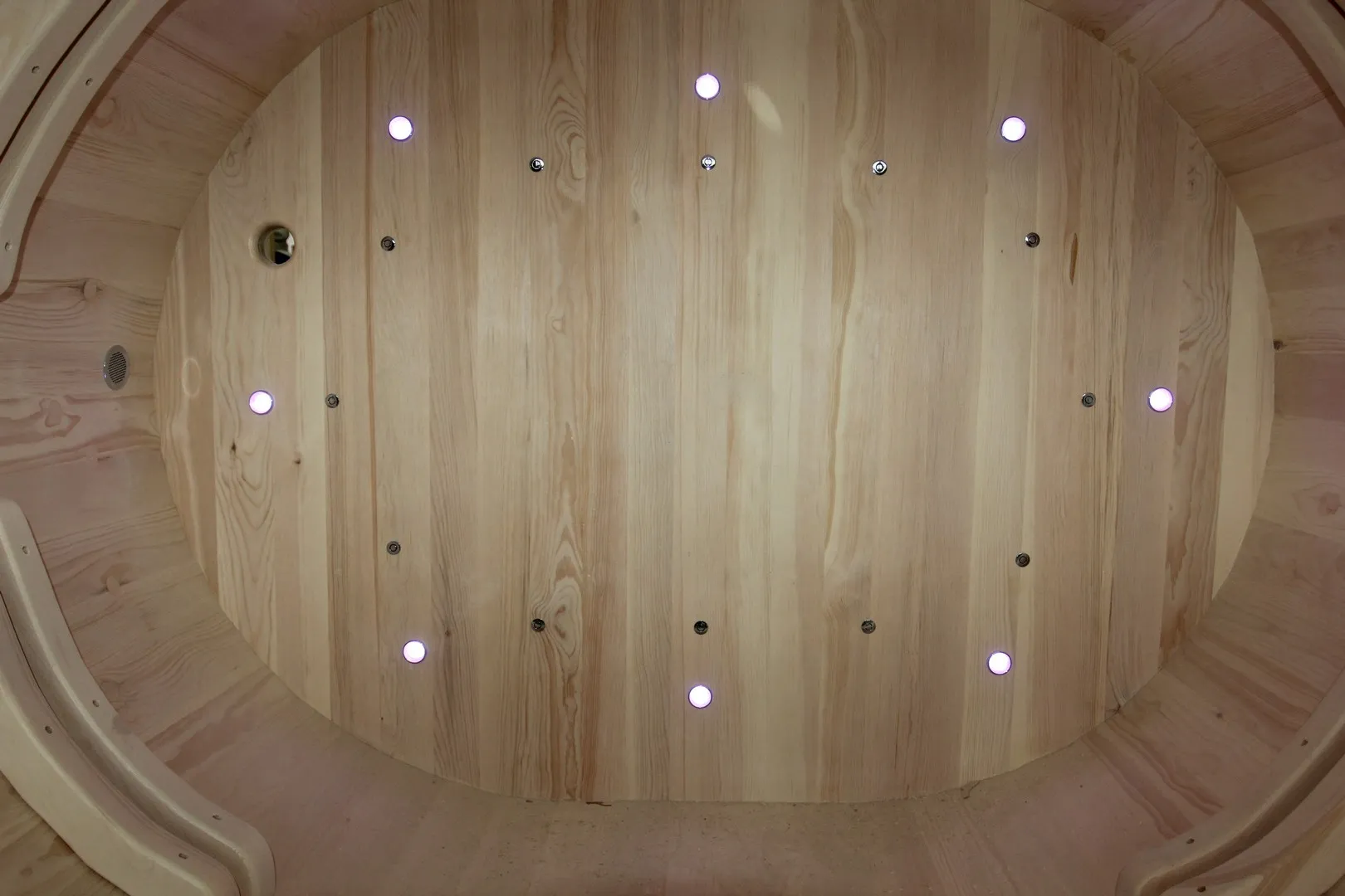 Светодиодные светильники 12В, встроенные в стенки купели, подсвечивают воду всеми цветами радуги.