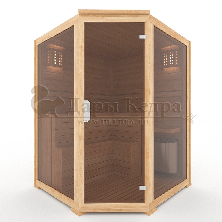 Двухместная угловая финская сауна кабина из кедра с электрокаменкой Это специально оборудованная деревянная кабина для сухого и влажного парения. Электропечь нагревает пространство внутри и позволяет сбрызгивать камни водой, слегка увлажняя воздух. Такая процедура позволяет избежать перегрева. Двойные стенки кабины с теплоизоляционным материалом удерживают тепло. Установка сауны в угол позволяет рационально использовать пространство помещения. Финская сауна с электропечью подойдет как для домашнего использования, так и для коммерции. Доставляется в разборном виде щитами, собирается по инструкции с помощью шуруповёрта. Обращаем Ваше внимание, что в стоимость сауны уже включена дверь с закаленным стеклом в раме из кедра с фиксатором и деревянным фасадом справа. Вы можете заменить фасад на цельностеклянный с безрамной дверью за дополнительную плату. Нагреваясь, древесина кедра выделяет полезные вещества-фитонциды, которые благотворно влияют на организм в целом и укрепляют иммунитет.